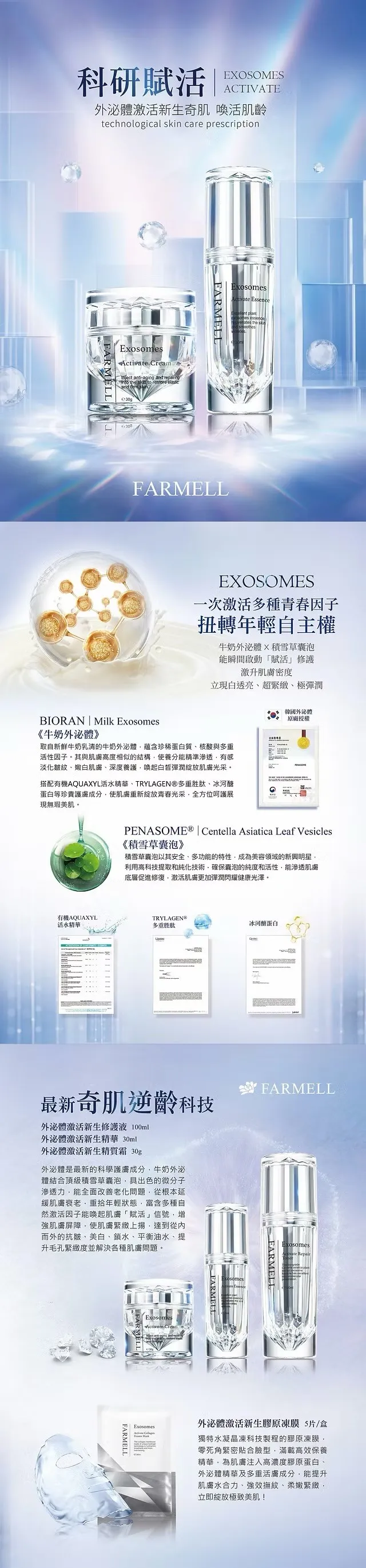 頂級牛奶外泌體結合積雪草囊泡全新配方,能全方位激活與修護肌膚,提升肌膚長效保濕水合力,高效緊緻,強效撫紋,讓肌膚由內而外緊緻柔嫩,綻放彈潤奇肌!